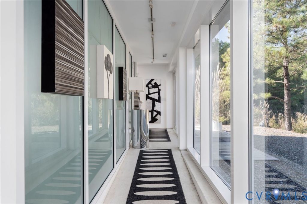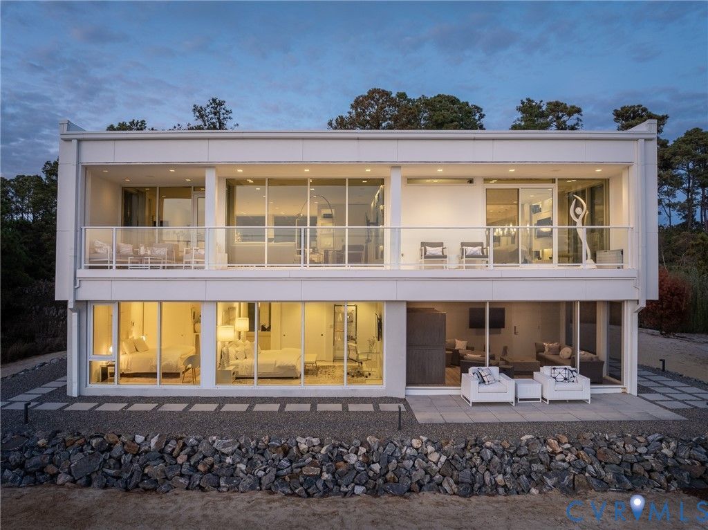 Poised above the sweeping expanse of the Rappahannock River, 448 Windjammer Lane presents a modern interpretation of Northern Neck waterfront living. Designed by architect Randall Kipp, the home reflects a thoughtful balance of contemporary architecture, durability, and connection to its natural surroundings, where water, light, and sky shape daily life. Expanses of glass frame river views from nearly every living space, allowing the landscape to inform the interior experience. Clean architectural lines are softened by warm materials, creating spaces that feel intentional yet inviting.The seamless relationship between indoor and outdoor living supports entertaining, dining al fresco, and quiet retreat. The 3,344 +/- square foot residence spans two levels with nine foot ceilings and includes an elevator adding effortless accessibility. The upper level is anchored by an open great room with a gas fireplace, dining area, and kitchen oriented toward the river. The kitchen features German Bulthaup cabinetry, a pantry with under counter refrigeration, and a layout designed for both everyday living and hosting. The primary suite is also on this level and offers sweeping river views, an en suite bath with soaking tub and double vanity, and his and hers walk in closets. The lower level functions as a private guest retreat with two bedrooms, a full bath, a secondary living area with kitchenette, and laundry. From this level, the home opens to a screened porch with sauna that leads directly to the private beach, inviting mornings by the water and unhurried days along the shoreline. Constructed with resilience in mind, the home features a steel frame structure, geothermal heating and cooling with radiant floor heat, roof mounted solar panels, whole house generator, and maintenance free stucco exterior. A finished two car garage adds convenience, and preliminary plans for an additional bedroom, full bath, and pool offer future flexibility.